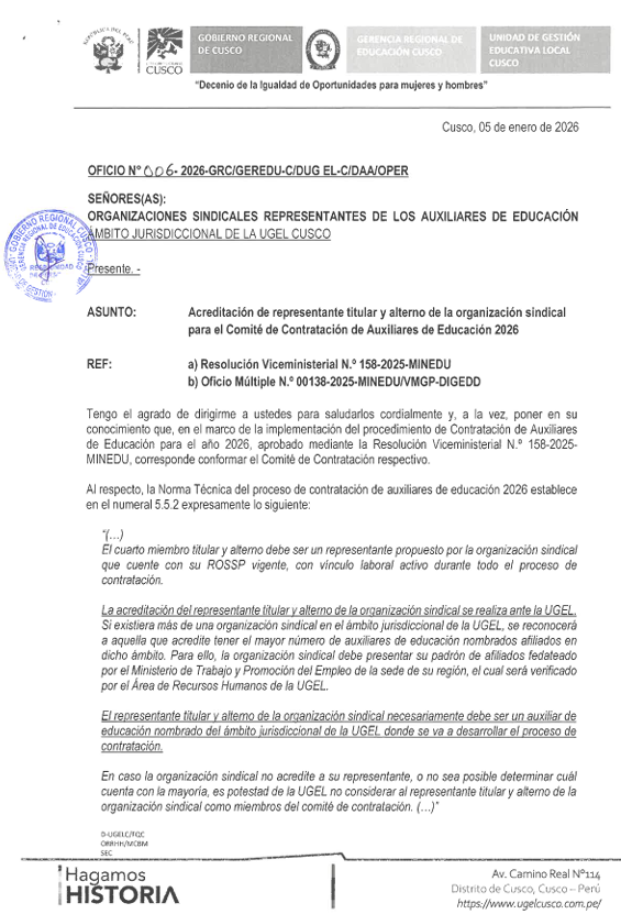 OFICIO MULTIPLE N° N° 006 – 2026/ GR-C/ GEREDU -C/ DUGEL-C/ DAA/ OPER