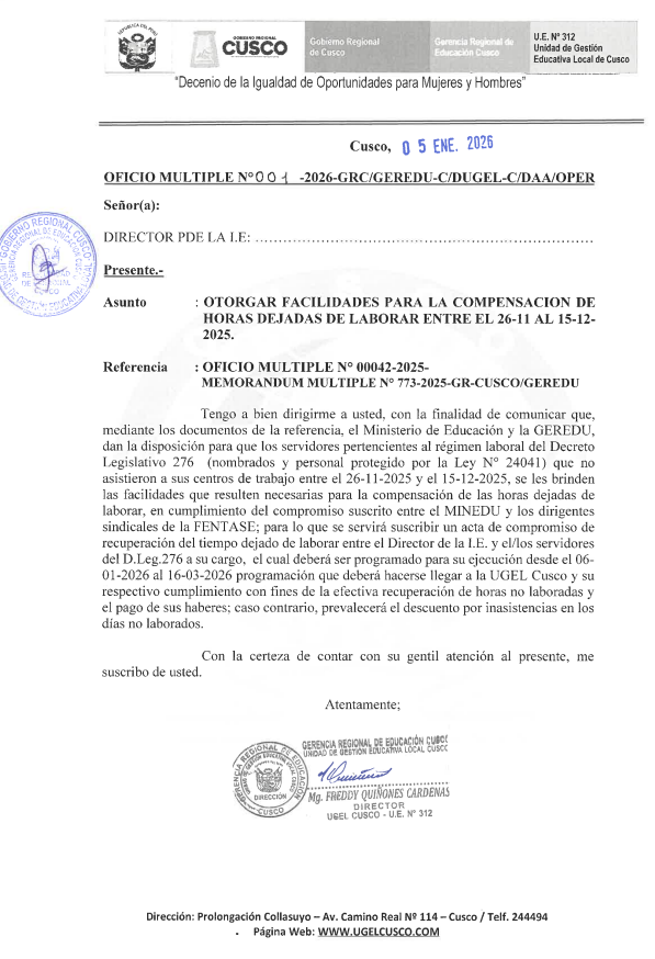 OFICIO MULTIPLE N° 001 – 2026-GRC/ GEREDU -C/ DUGEL-C/ DAA/ OPER