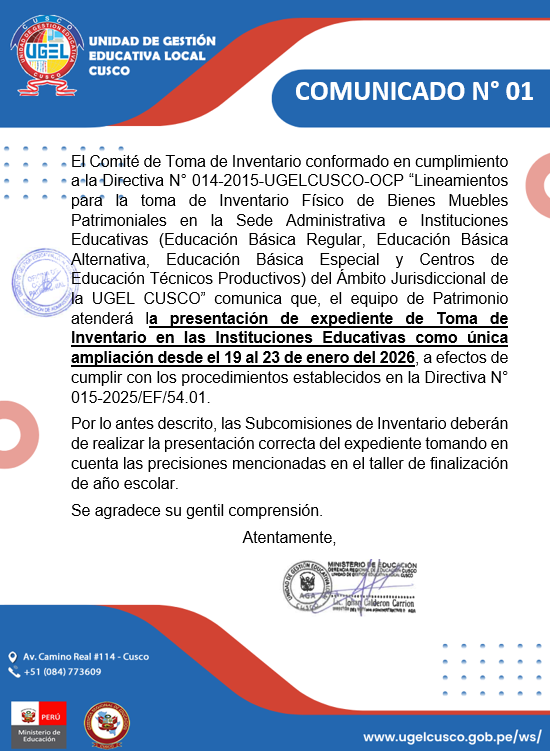 Se informa a la comunidad educativa que las siguientes Instituciones Educativas Públicas del nivel Primaria cuentan con vacantes disponibles para el presente año. Los padres de familia interesados pueden comunicarse directamente con cada institución educativa para conocer los requisitos del proceso de matrícula. 🔹 IE N.° 50039📍 Dirección: Calle San Francisco de Asís s/n📌 Localidad: Uchullo Alto🗺️ Distrito: Cusco👩🏫 Directora: […]