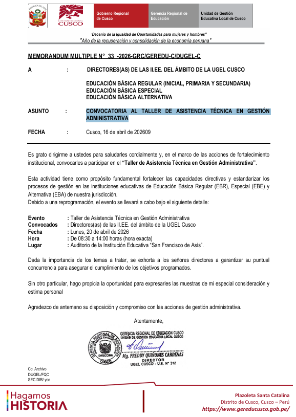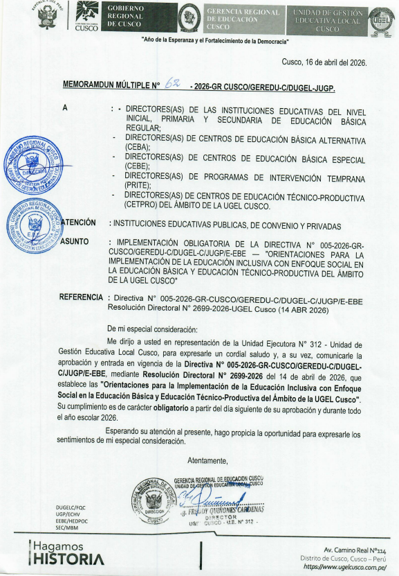 OFICIO MULTIPLE N°026 – 2026-GRC/GEREDU-C/DUGEL-C/UGP/EP.