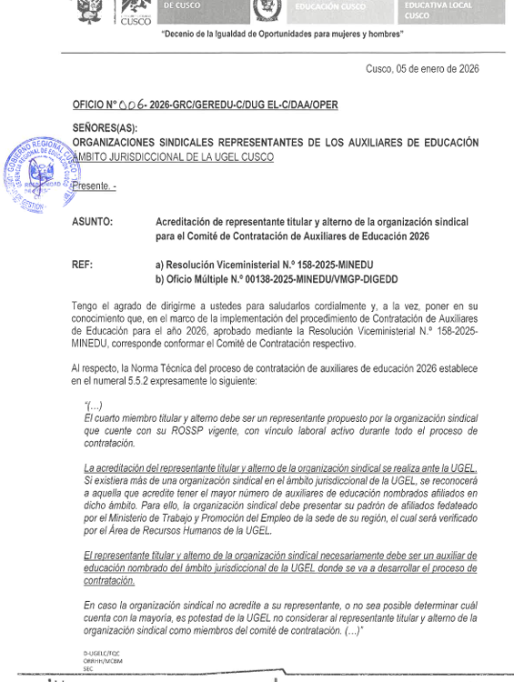 OFICIO MULTIPLE N° N° 006 – 2026/ GR-C/ GEREDU -C/ DUGEL-C/ DAA/ OPER