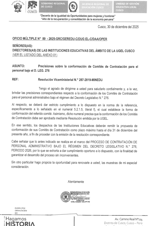 30 Dic 2025 Ugel Cusco Oficios 30 de diciembre de 2025 OFICIO MULTIPLE N° 089-2025-GR-C/ GEREDU-C/ DUGEL-C – DAA – OPER ASUNTO: PRECISIONES SOBRE LA CONFORMACIÓN DE COMITÉS DE CONTRATACIÓN PARA EL PERSONAL BAJO EL DL N° 276Leer Más