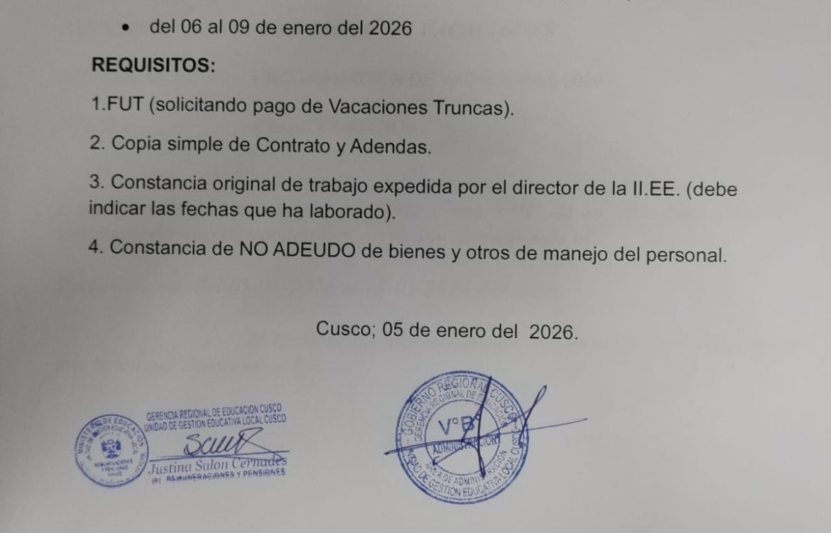 05 Ene 2026 Ugel Cusco Comunicados 5 de enero de 2026 COMUNICADO – OFICINA DE REMUNERACIONES – PAGO DE VACACIONES TRUNCAS Leer Más