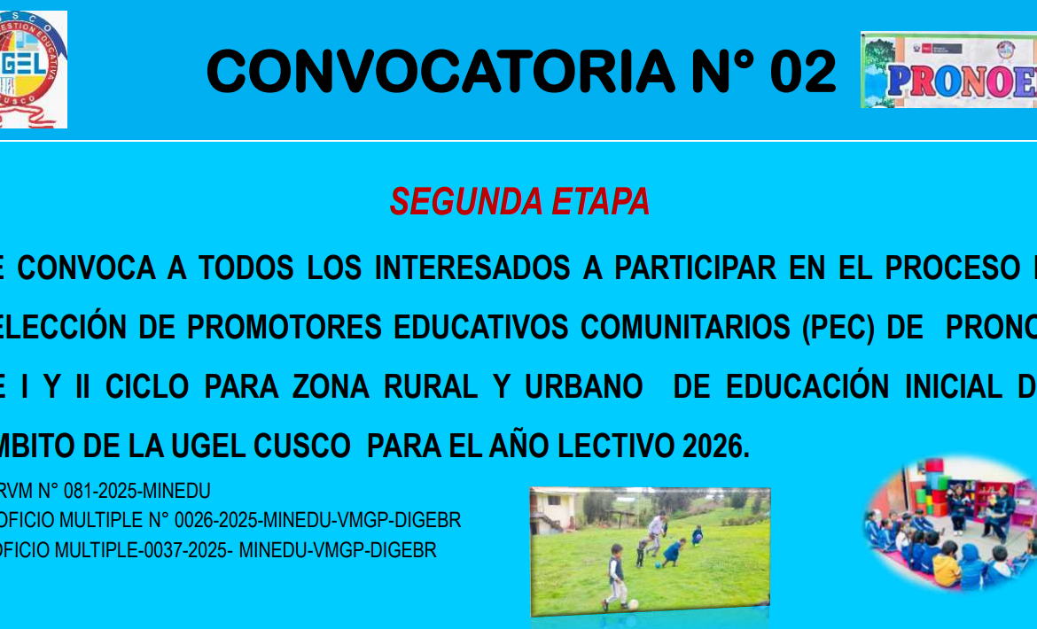28 Nov 2025 Ugel Cusco Comunicados 28 de noviembre de 2025 CONVOCATORIA N° 02 – PRONOEI SEGUNDA ETAPA Leer Más