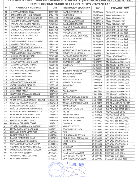 15 Jul 2025 Ugel Cusco Comunicados 15 de julio de 2025 COMUNICADO – OFICINA DE TRAMITE DOCUMENTARIO EXPEDIENTES OBSERVADOS EN LA OFICINA DE TRAMITE DOCUMENTARIOLeer Más