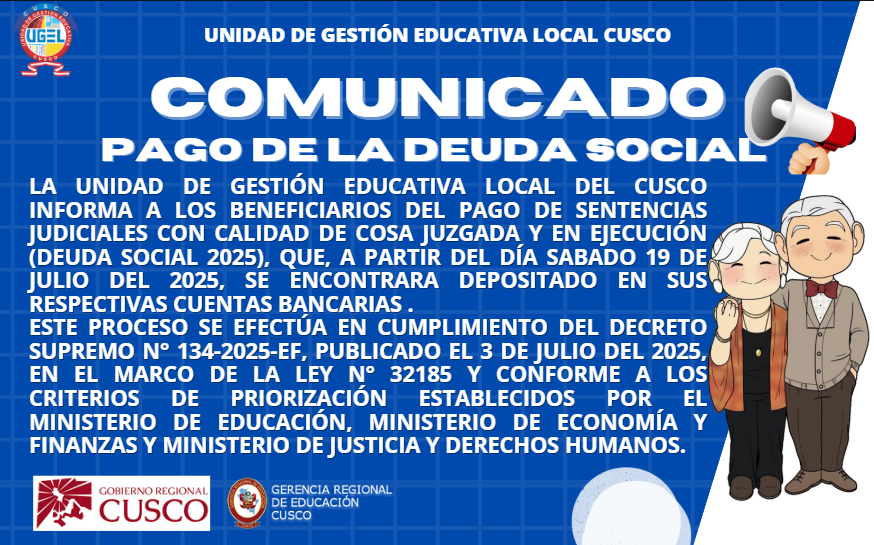 17 Jul 2025 Ugel Cusco Comunicados 17 de julio de 2025 COMUNICADO- DEUDA SOCIAL CONSULTA DEUDA SOCIAL SALDOS DEL GOBIERNO REGIONAL 2024Leer Más