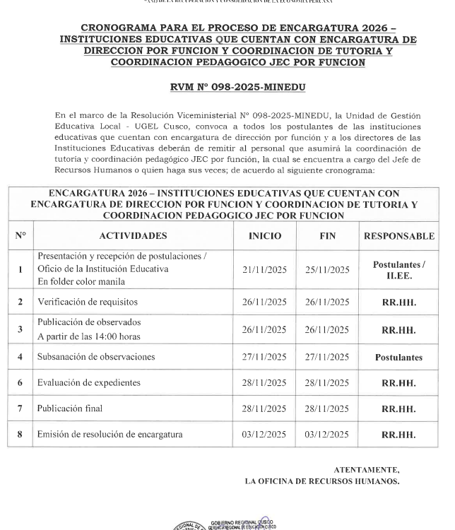 19 Nov 2025 Ugel Cusco Comunicados 19 de noviembre de 2025 ENCARGATURA 2026 EN IIEE POR FUNCIONES VER CRONOGRAMA >>> RVM N° 098-2025-MINEDU >>>Leer Más