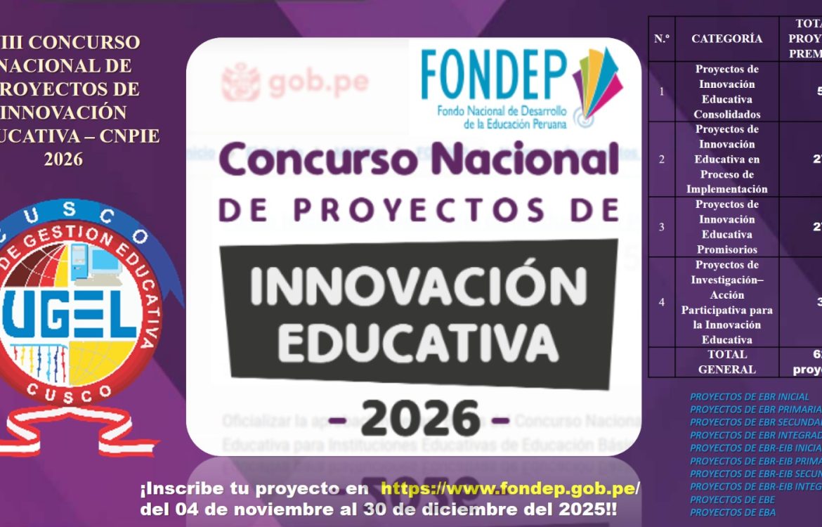 13 Nov 2025 Ugel Cusco Comunicados 13 de noviembre de 2025 Convocatoria al VIII CNPIE 2026 Se convoca a las instituciones educativas públicas del ámbito de la UGEL Cusco a participar en el VIII Concurso Nacional de Proyectos de Leer Más