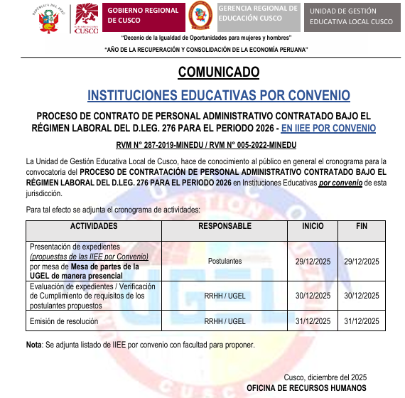 PROCESO DE CONTRATO DE PERSONAL ADMINISTRATIVO CONTRATADO BAJO EL RÉGIMEN LABORAL DEL D.LEG. 276 PARA EL PERIODO 2026 – EN IIEE POR
