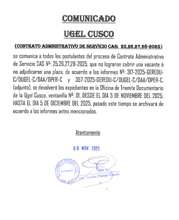 06 Nov 2025 Ugel Cusco Comunicados 6 de noviembre de 2025 COMUNICADO – OFICINA DE TRAMITE DOCUMENTARIO Leer Más