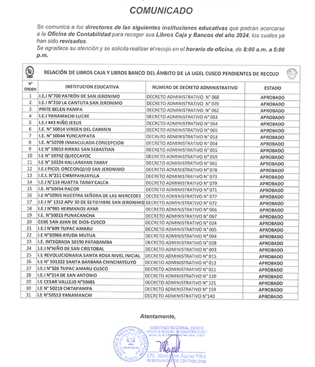 Estimados Directores de IIEE Niveles Inicial, Primaria y Secundaria de EBR, EBE, EBA y ETP PÚBLICAS Y PRIVADAS del ámbito de la UGEL Cusco.