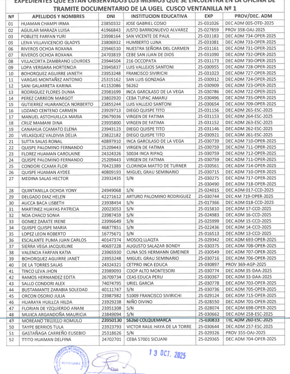 13 Oct 2025 Ugel Cusco Comunicados 13 de octubre de 2025 COMUNICADO – OFICINA DE TRAMITE DOCUMENTARIO EXPEDIENTES OBSERVADOSLeer Más