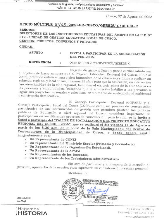 07 Ago 2023 Ugel Cusco Oficios 7 de agosto de 2023 OFICIO MULTIPLE N° 198-2023-GRC-CUSCO-GEREDU-D-UGEL-C. ASUNTO: INVITA A PARTICIPAR EN LA SOCIALIZACIÓN DEL PER-2036 Leer másLeer Más