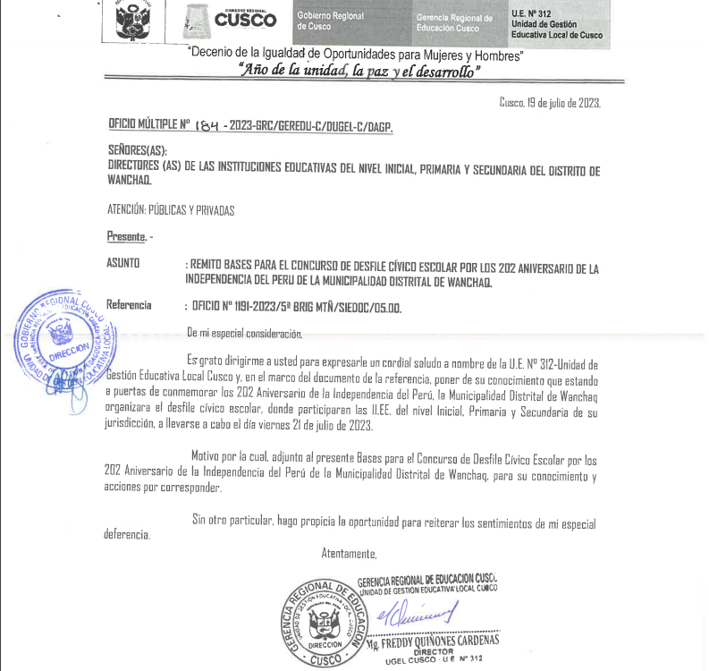 19 Jul 2023 Ugel Cusco Oficios 19 de julio de 2023 OFICIO MULTIPLE N° 184-2023-GRC/GEREDU-C/DUGEL-C/DAGP ASUNTO: REMITO BASES PARA EL CONCURSO DE DESFILE CIVICO ESCOLAR POR LOS 202 ANIVERSARIO DE LA INDEPENDENCIA DEL PERU DE LA MUNICIPALIDAD Leer Más