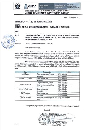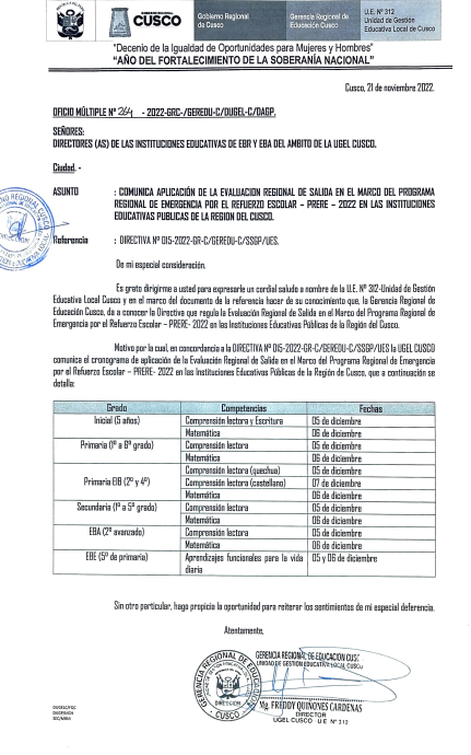 21 Nov 2022 Ugel Cusco Oficios 21 de noviembre de 2022 OFICIO MÚLTIPLE N°264-2022-GRC-/GEREDU-C/DUGEL-C/DAGP. ASUNTO:COMUNICA APLICACION DE LA EVALUACION REGIONAL DE SALIDA EN EL MARCO DEL PROGRAMA REGIONAL DE EMERGENCIA POR EL REFUERZO ESCOLAR – Leer Más