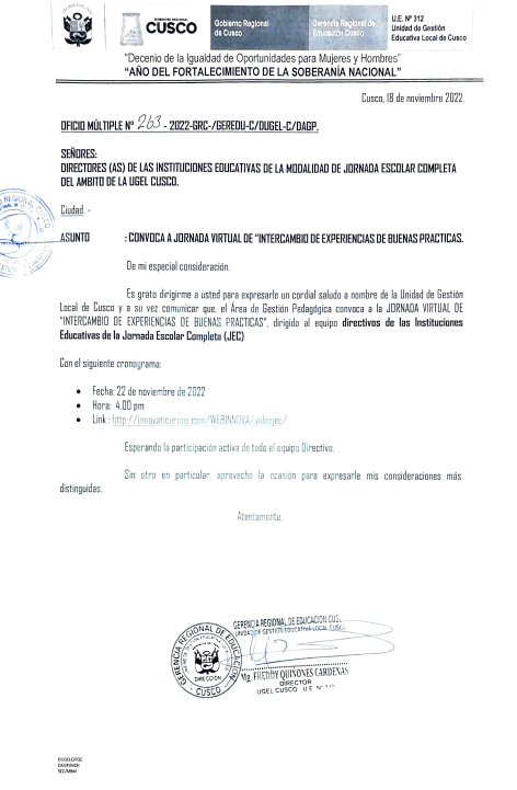 18 Nov 2022 Ugel Cusco Oficios 18 de noviembre de 2022 OFICIO MÚLTIPLE N°263-2022-GRC-/GEREDU-C/DUGEL-C/DAGP. ASUNTO: CONVOCA A JORNADA VIRTUAL DE «INTERCAMBIO DE EXPERIENCIAS DE BUENAS PRACTICAS. Leer másLeer Más