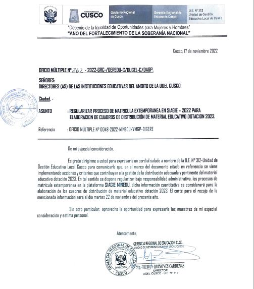 18 Nov 2022 Ugel Cusco Oficios 18 de noviembre de 2022 OFICIO MÚLTIPLE N°1695-2022-GRC-/GEREDU-C/DUGEL-C/DAGP. ASUNTO: CONSIDERACIONES PARA EL DESARROLLO DEL PROCESO DE MATRICULA 2023 Leer másLeer Más