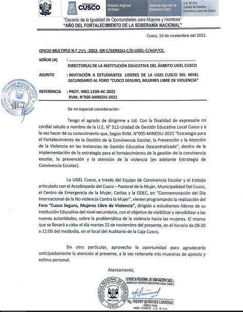 16 Nov 2022 Ugel Cusco Oficios 16 de noviembre de 2022 OFICIO MÚLTIPLE N°259-2022-GR-C/GEREDU-C/D-UGEL-C/AGP/CE ASUNTO: INVITACIÓN A ESTUDIANTES LÍDERES DE LA UGEL CUSCO DEL NIVEL SECUNDARIO AL FORO «CUSCO SEGURO, MUJERES LIBRE DE VIOLENCIA» Leer másLeer Más