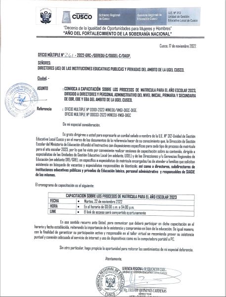 17 Nov 2022 Ugel Cusco Oficios 17 de noviembre de 2022 OFICIO MÚLTIPLE N°261-2022-GRC-/GEREDU-C/DUGEL-C/DAGP. ASUNTO: CONVOCA A CAPACITACIÓN SOBRE LOS PROCESOS DE MATRÍCULA PARA EL AÑO ESCOLAR 2023, DIRIGIDO A DIRECTORES Y PERSONAL ADMINISTRATIVO DEL Leer Más