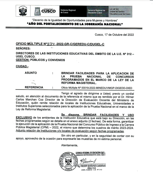 ASUNTO: BRINDAR FACILIDADES PARA LA APLICACION DE LA PRUEBA NACIONAL DE CONCURSOS PROGRAMADOS EN EL MARCO DE LA LEY DE LA REFORMA MAGISTERIAL. Leer más