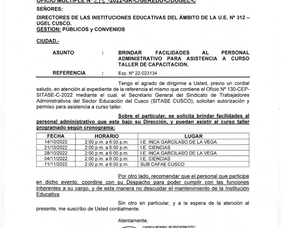 12 Oct 2022 Ugel Cusco Oficios 12 de octubre de 2022 OFICIO MÚLTIPLE N°230-2022-GR-C/GEREDU-C/DUGEL-C ASUNTO: AMPLIA INFORMACIÓN AL OFICIO MÚLTIPLE N°215-2022-GR-C/GEREDU-C/DUGEL-C REFERENTE A BRINDAR FACILIDADES AL PERSONAL ADMINISTRATIVO PARA Leer Más