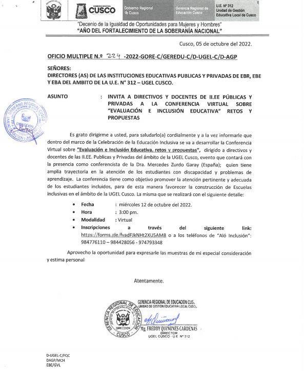 05 Oct 2022 Ugel Cusco Oficios 5 de octubre de 2022 0 OFICIO MÚLTIPLE N°224-2022-GORE-C/GEREDU-C/D-UGEL-C/D-AGP. ASUNTO: INVITA A DIRECTIVOS Y DOCENTES DE II.EE PUBLICAS Y PRIVADAS A LA CONFERENCIA VIRTUAL SOBRE «EVALUACION E INCLUSION EDUCATIVA» RETOS Y Leer Más