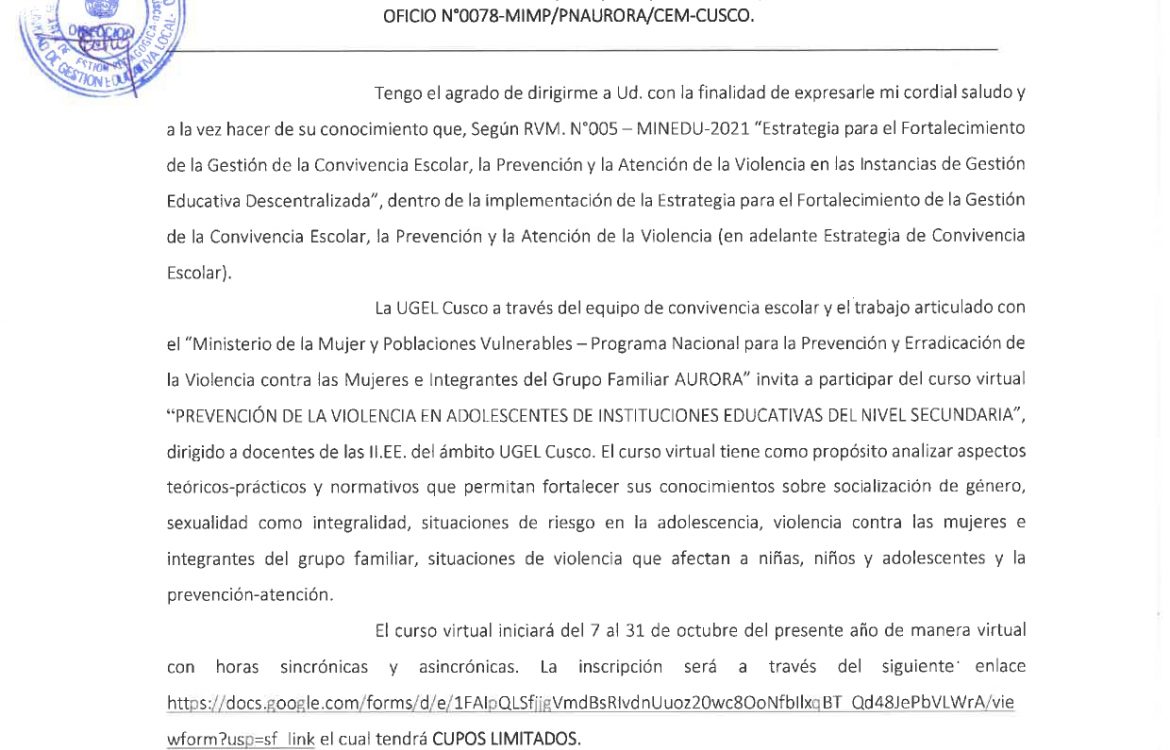 05 Oct 2022 Ugel Cusco Oficios 5 de octubre de 2022 OFICIO MÚLTIPLE N°225-2022/GRC/GREC/UGEL-C/DAGP/CE. ASUNTO: INVITA A CURSO VIRTUAL PARA DOCENTES «PREVENCIÓN DE LA VIOLENCIA EN ADOLESCENES DE INSTITUCIONES EDUCATIVAS DEL NIVEL SECUNDARIA» Leer másLeer Más