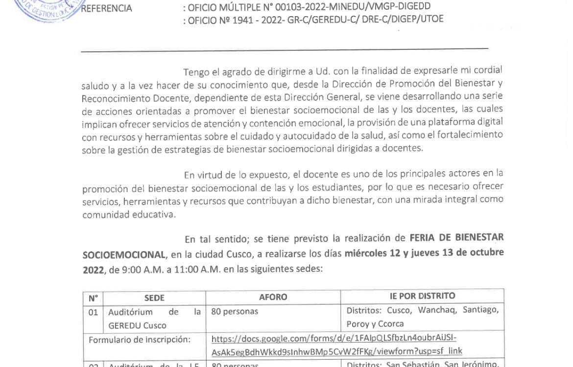 05 Oct 2022 Ugel Cusco Oficios 5 de octubre de 2022 OFICIO MÚLTIPLE N°226-2022-GR-C/GEREDU-C/D-UGEL-C/AGP/CE. ASUNTO: FERIA DE BIENESTAR SOCIOEMOCIONAL DOCENTE 2022. Leer másLeer Más