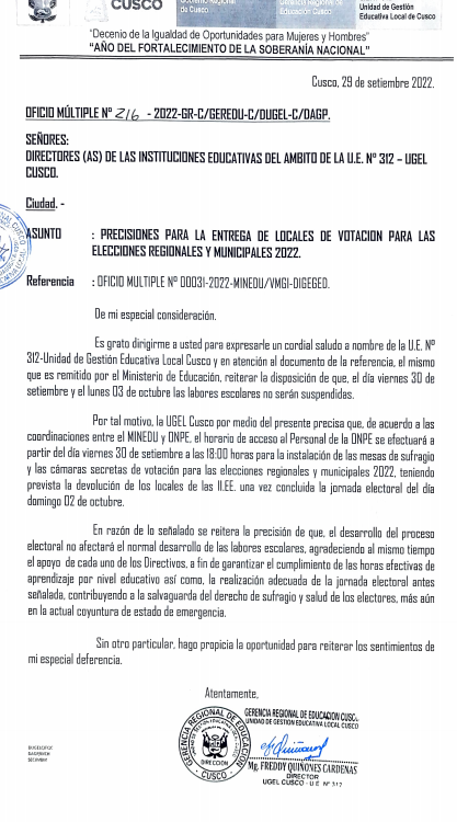 29 Sep 2022 Ugel Cusco Oficios 29 de septiembre de 2022 OFICIO MÚLTIPLE N°216-2022-GRC-/GEREDU-C/DUGEL-C/DAGP. ASUNTO: PRECISIONES PARA LA ENTREGA DE LOCALES DE VOTACION PARA LAS ELECCIONES REGIONALES Y MUNICIPALES 2022 LEER MASLeer Más