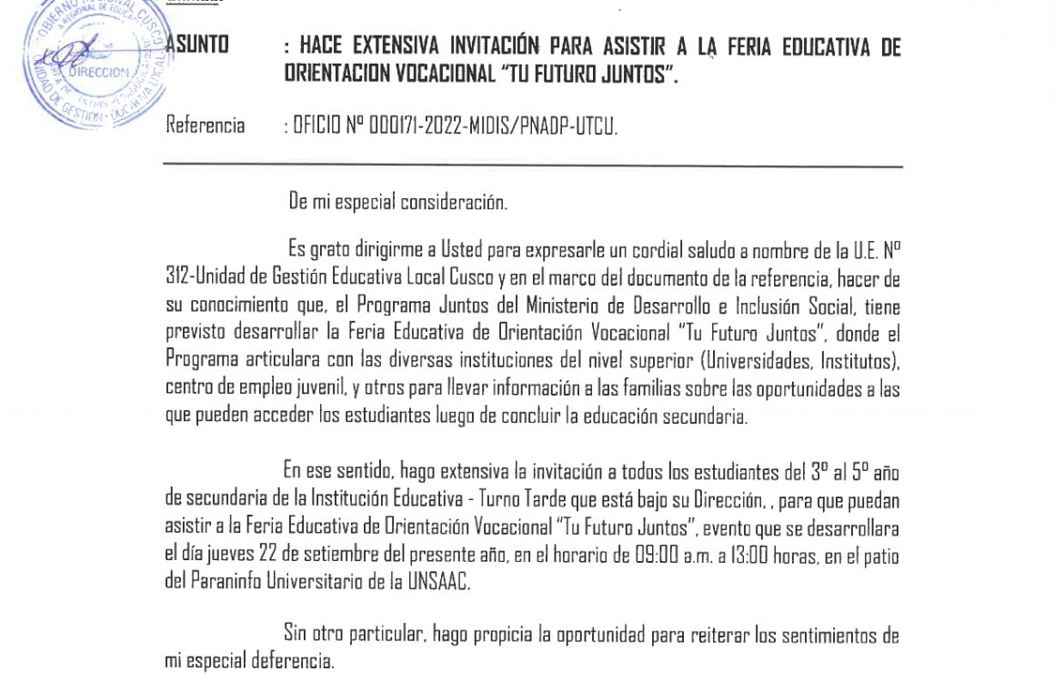 20 Sep 2022 Ugel Cusco Oficios 20 de septiembre de 2022 OFICIO MÚLTIPLE N°212-2022-GRC-/GEREDU-C/DUGEL-C/DAGP. ASUNTO: HACE EXTENSIVA INVITACIÓN PARA ASISTIR A LA FERIA EDUCATIVA DE ORIENTACIÓN VOCACIONAL «TU FUTURO JUNTOS». LEER MÁSLeer Más