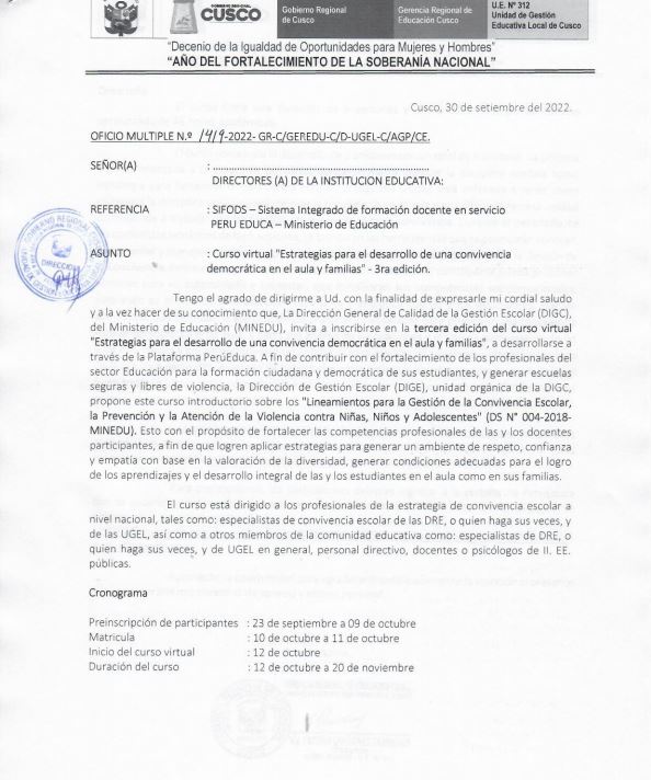 03 Oct 2022 Ugel Cusco Oficios 3 de octubre de 2022 OFICIO MÚLTIPLE N° 1419-2022-GR-C/GEREDU-C/D-UGEL-C/AGP/CE ASUNTO: CURSO VIRTUAL «ESTRATEGIAS PARA EL DESARROLLO DE UNA CONVIVENCIA DEMOCRATICA EN EL AULA Y FAMILIA» – TERCERA EDICION. LEER MASLeer Más