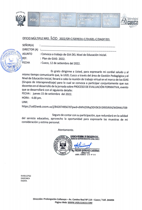 12 Sep 2022 Ugel Cusco Oficios 12 de septiembre de 2022 OFICIO MÚLTIPLE N°200-2022/GR-C/DRE-C/DUGEL-C/DAGP/EEI. ASUNTO: CONVOCA A TRABAJO GIA DEL NIVEL DE EDUCACION INICIAL PLAN DE GIAS – 2022 Leer más Leer Más