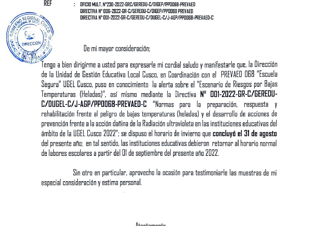 09 Sep 2022 Ugel Cusco Oficios 9 de septiembre de 2022 OFICIO MÚLTIPLE N°197-2022-GEREDU-C/UGEL-312/J-AGP/PREVAED ASUNTO: CONCLUSIÓN DEL HORARIO DE INVIERNO Y RETORNO AL HORARIO NORMAL DE LABORES ESCOLARES A PARTIR DEL 01/09/2022 Leer másLeer Más