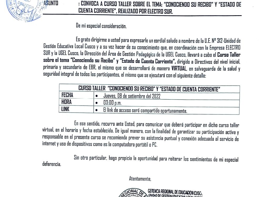 06 Sep 2022 Ugel Cusco Oficios 6 de septiembre de 2022 OFICIO MÚLTIPLE N°191-2022-GRC-/GEREDU-C/DUGEL-C/DAGP. ASUNTO: CONVOCA A CURSO TALLER SOBRE EL TEMA «CONOCIENDO SU RECIBO» Y «ESTADO DE CUENTA CORRIENTE», REALIZADO POR ELECTRO SUR. Leer másLeer Más