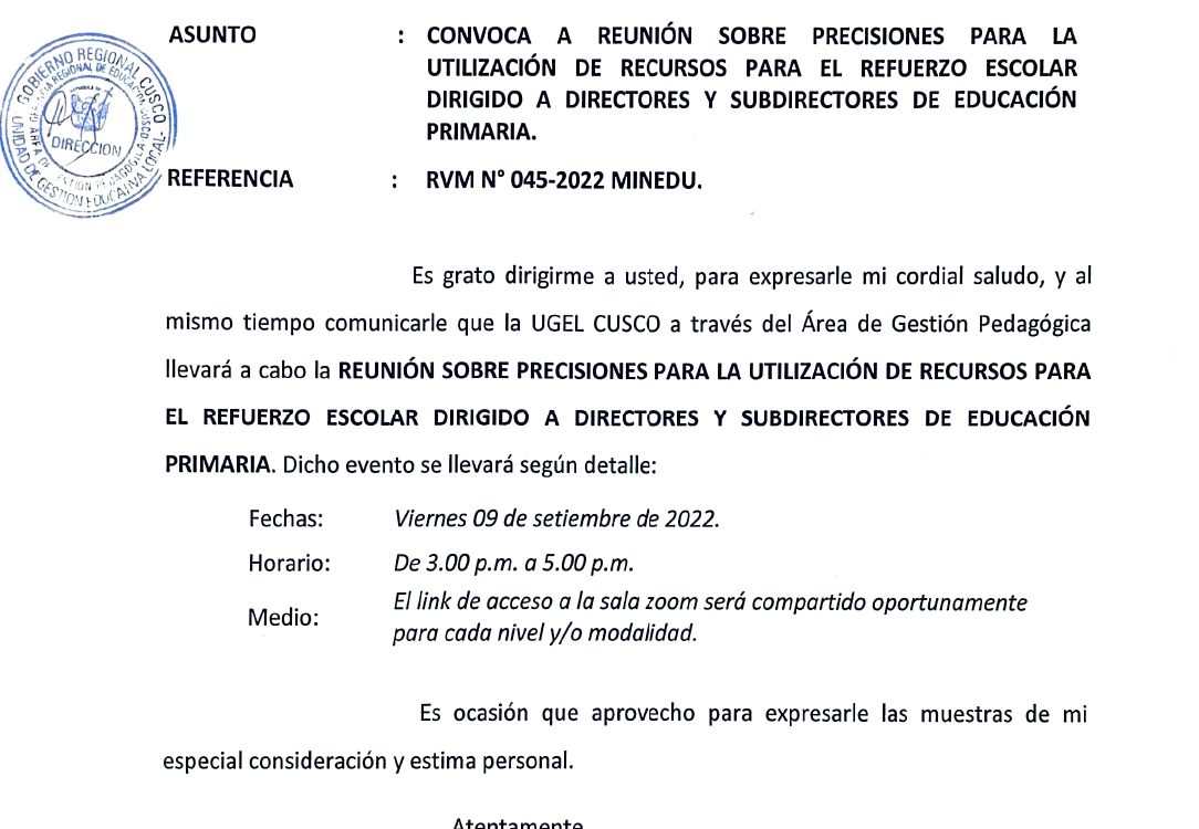 08 Sep 2022 Ugel Cusco Oficios 8 de septiembre de 2022 OFICIO MÚLTIPLE N°192-2022/GR-C/GEREDU-C/DUGEL-C/DAGP/EP ASUNTO: CONVOCA A REUNIÓN SOBRE PRECISIONES PARA LA UTILIZACIÓN DE RECURSOS PARA EL REFUERZO ESCOLAR DIRIGIDO A DIRECTORES Y SUBDIRECTORES DE Leer Más
