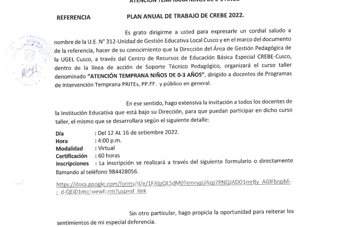 06 Sep 2022 Ugel Cusco Oficios 6 de septiembre de 2022 OFICIO MÚLTIPLE N°190-2022-GRC-/GEREDU-C/DUGEL-C/DAGP. ASUNTO: INVITA A CURSO TALLER «ATENCIÓN TEMPRANA NIÑOS DE 0-3 AÑOS» Leer másLeer Más