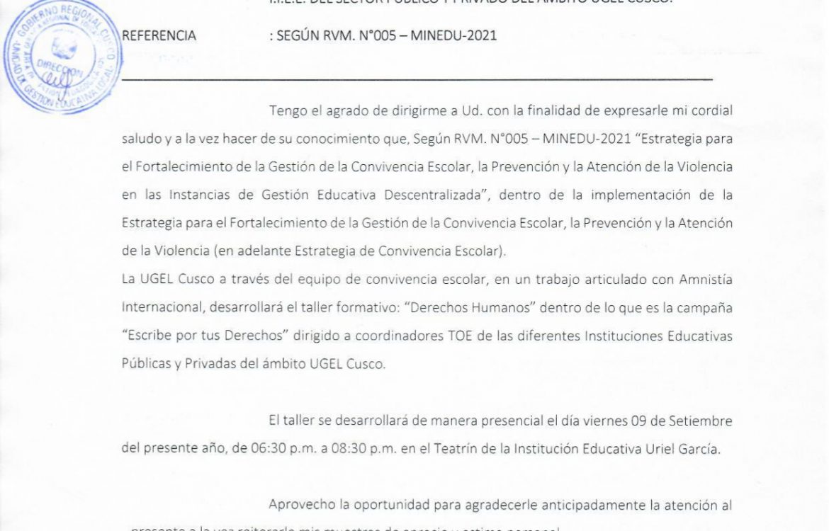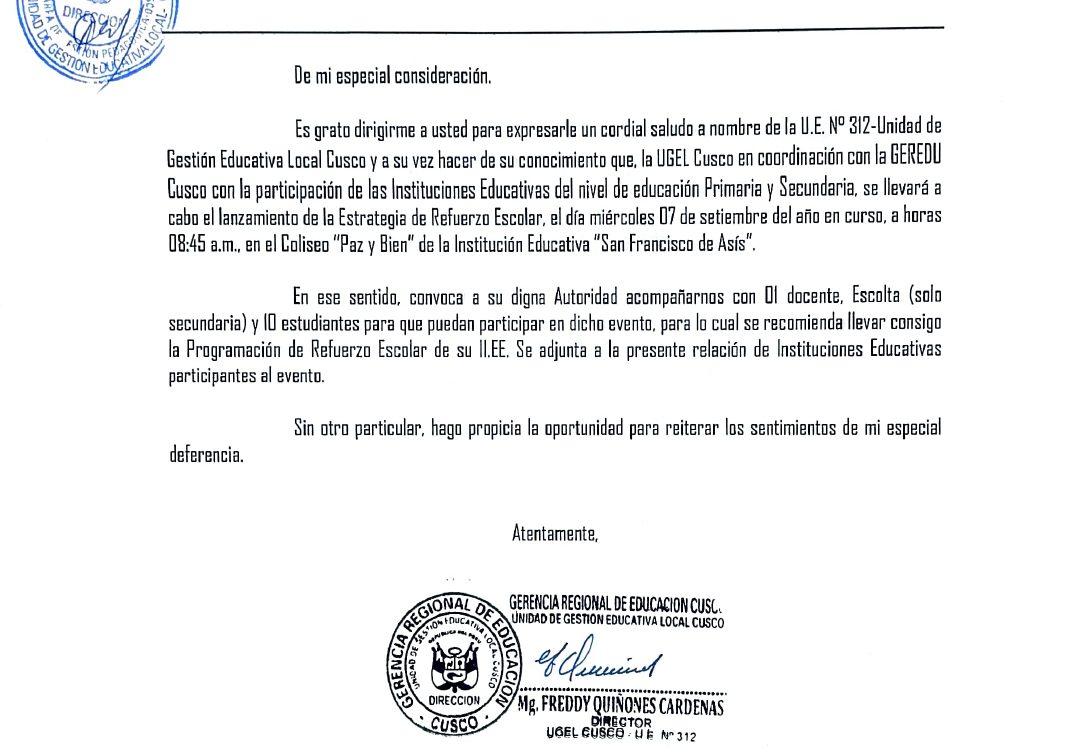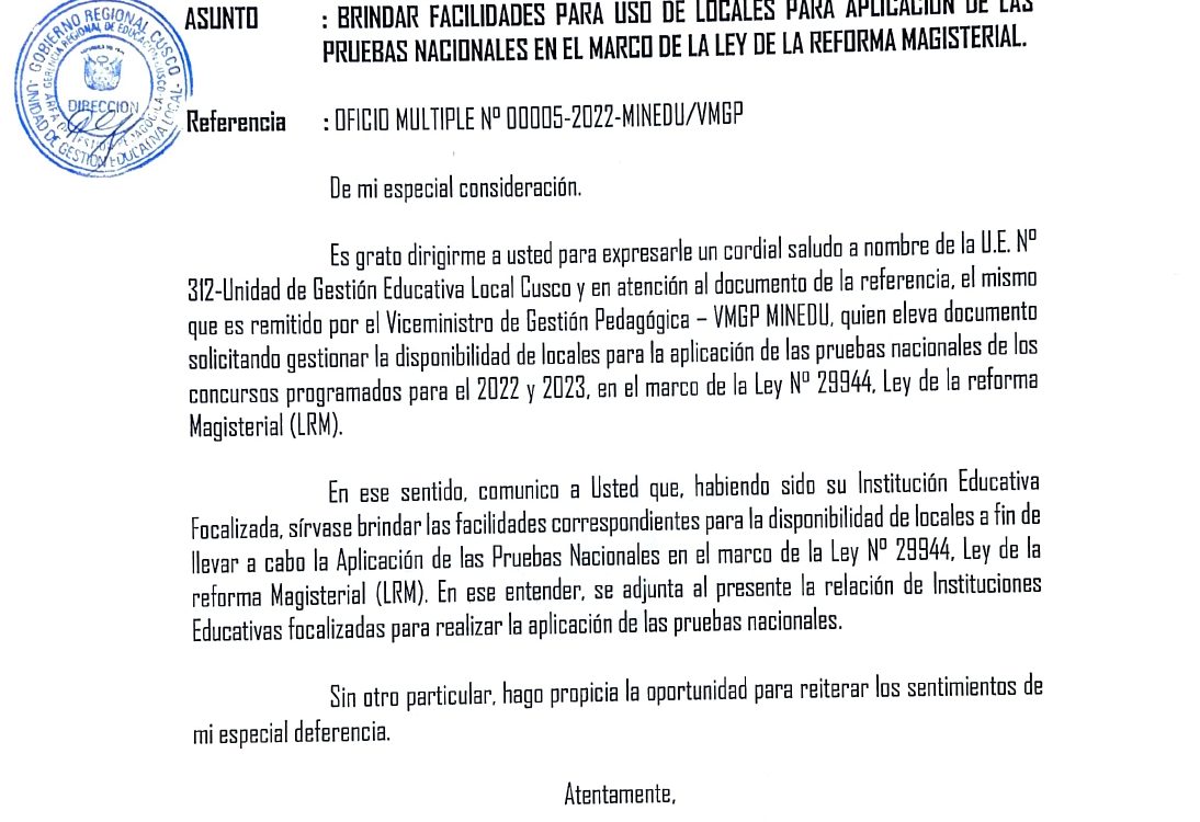 06 Sep 2022 Ugel Cusco Oficios 6 de septiembre de 2022 OFICIO MÚLTIPLE N°187 -2022-GR-C-/GEREDU-C/DUGEL-C/DAGP. ASUNTO: BRINDAR FACILIDADES PARA USO DE LOCALES PARA APLICACIÓN DE LAS PRUEBAS NACIONALES EN EL MARCO DE LA LEY DE LA REFORMA MAGISTERIAL. Leer másLeer Más