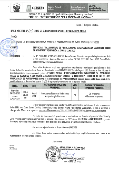 18 Ago 2022 Ugel Cusco Oficios 18 de agosto de 2022 OFICIO MULTIPLE N°175-2022-GRC/GEREDU-C/DUGEL-C/JAGP/C-PREVAED-C. ASUNTO: CONVOCA AL «TALLER VIRTUAL DE FORTALECIMIENTO DE CAPACIDADES EN GESTION DEL RIESGO DE DESASTRES Y ADAPTACION AL CAMBIO CLIMATICO. Leer másLeer Más