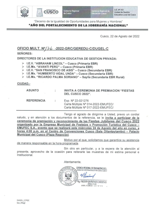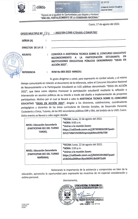 18 Ago 2022 Ugel Cusco Oficios 18 de agosto de 2022 OFICIO MULTIPLE N°174-2022-GRC/GEREDU-C/DUGEL-C/D-AGP/SEC. ASUNTO: CONVOCA A ASISTENCIA TECNICA SOBRE EL CONCURSO EDUCATIVO RECONOCIMIENTO A LA PARTICIPACION ESTUDIANTIL EN INSTITUCIONES PUBLICAS Leer Más