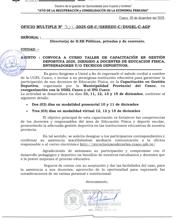 ASUNTO: CONVOCA A CURSO TALLER DE CAPACITACIÓN EN GESTIÓN DEPORTIVA 2025, DIRIGIDO A DOCENTES DE EDUCACIÓN FÍSICA, ENTRENADORES Y/O TÉCNICOS DEPORTIVOS