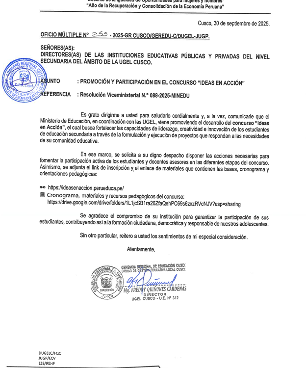 30 Sep 2025 Ugel Cusco Oficios 30 de septiembre de 2025 OFICIO MULTIPLE N° 255-2025-GR CUSCO/ GEREDU-C/ DUGEL-JUGP ASUNTO: PROMOCIÓN Y PARTICIPACIÓN EN EL CONCURSO “IDEAS EN ACCION”Leer Más