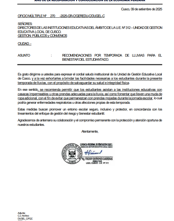 09 Oct 2025 Ugel Cusco Oficios 9 de octubre de 2025 OFICIO MULTIPLE Nº 270 -2025-GR-C/GEREDU-C/DUGEL-C ASUNTO : RECOMENDACIONES POR TEMPORADA DE LLUVIAS PARA EL BIENESTAR DEL ESTUDIANTADOLeer Más