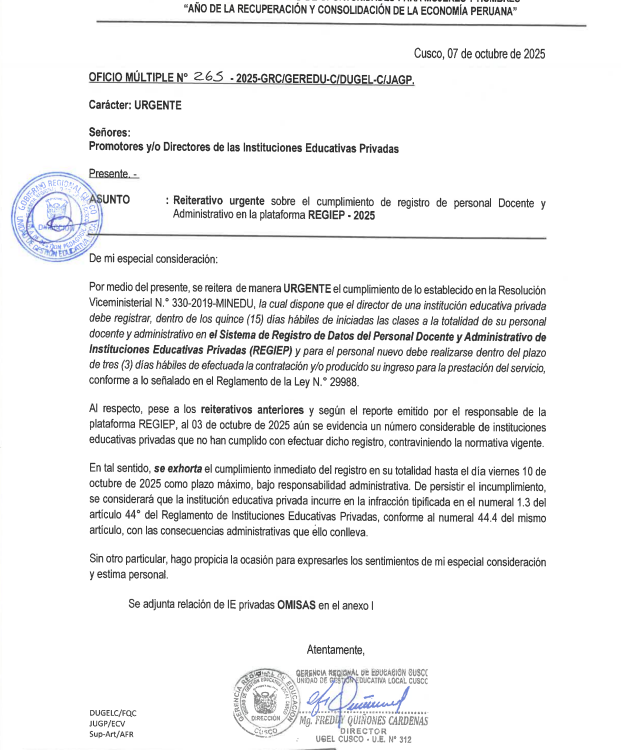 07 Oct 2025 Ugel Cusco Oficios 7 de octubre de 2025 OFICIO MULTIPLE N° 265 – 2025-GRC/GEREDU-C/DUGEL-C/JAGP ASUNTO: REITERATIVO URGENTE SOBRE EL CUMPLIMIENTO DE REGISTRO DE PERSONAL DOCENTE Y ADMINISTRATIVO EN LA PLATAFORMA REGIEP-2025.Leer Más
