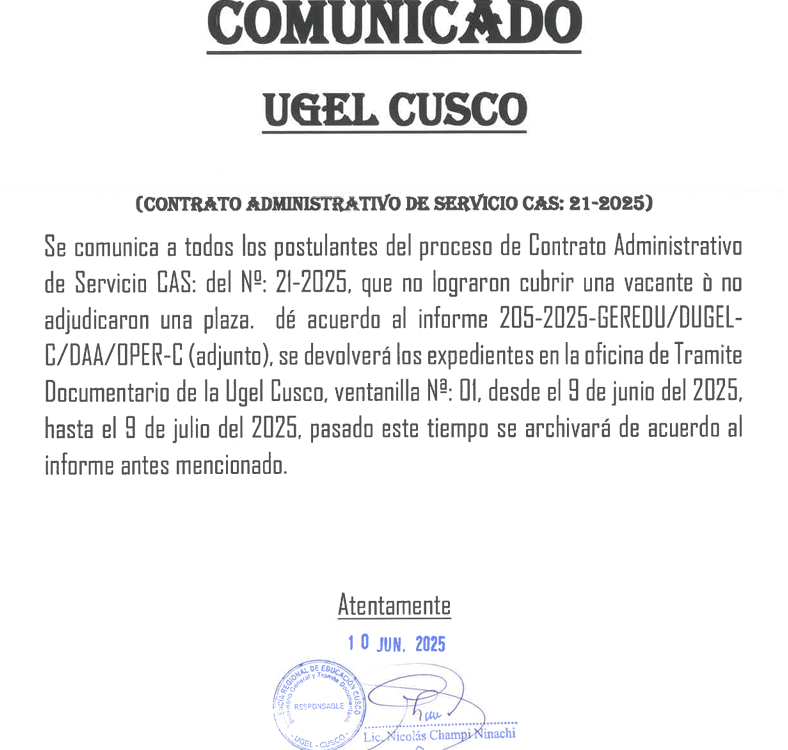 Comunicado Contrato Administrativo de Servicios CAS N° 21-20258