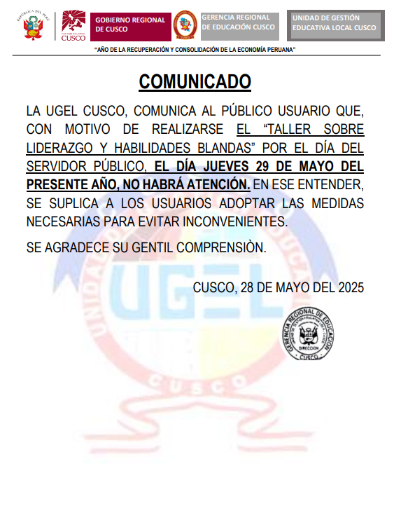 28 May 2025 Ugel Cusco Comunicados 28 de mayo de 2025 Comunicado Importante Anterior Noticia Siguiente Noticia
