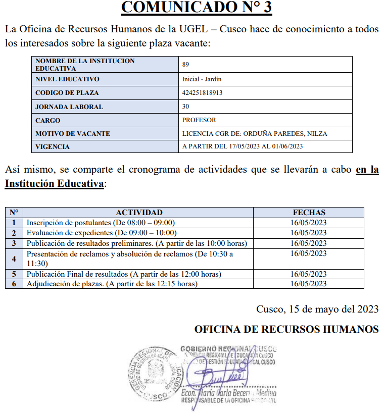La Oficina de Recursos Humanos de la UGEL – Cusco hace de conocimiento a todos