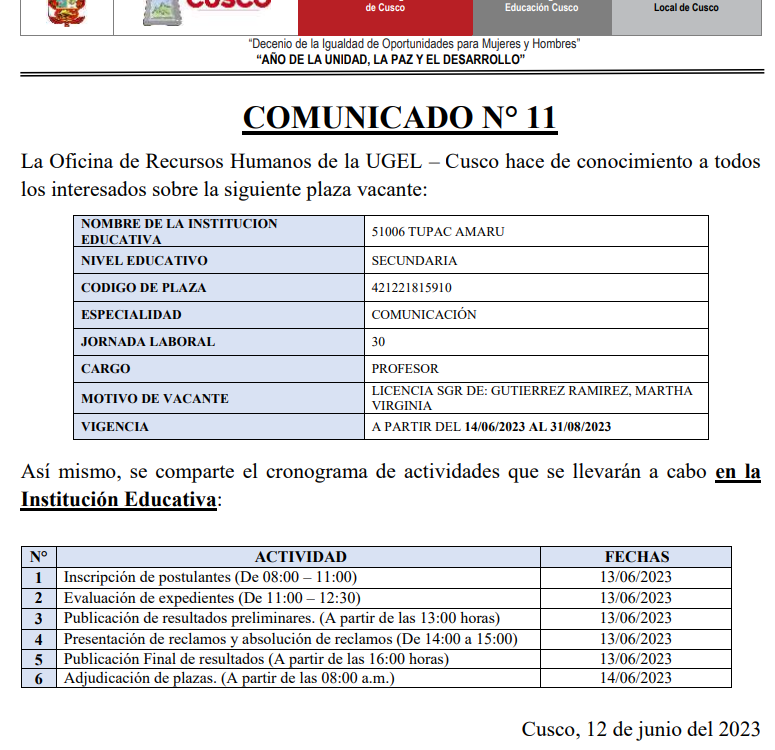 12 Jun 2023 Ugel Cusco Comunicados 12 de junio de 2023 COMUNICADO N° 11 – OFICINA DE PERSONAL Leer mas… Anterior Noticia Siguiente Noticia