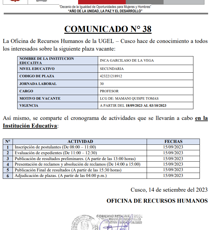 La Oficina de Recursos Humanos de la UGEL – Cusco, hace de conocimiento a todos los interesados lo siguiente: