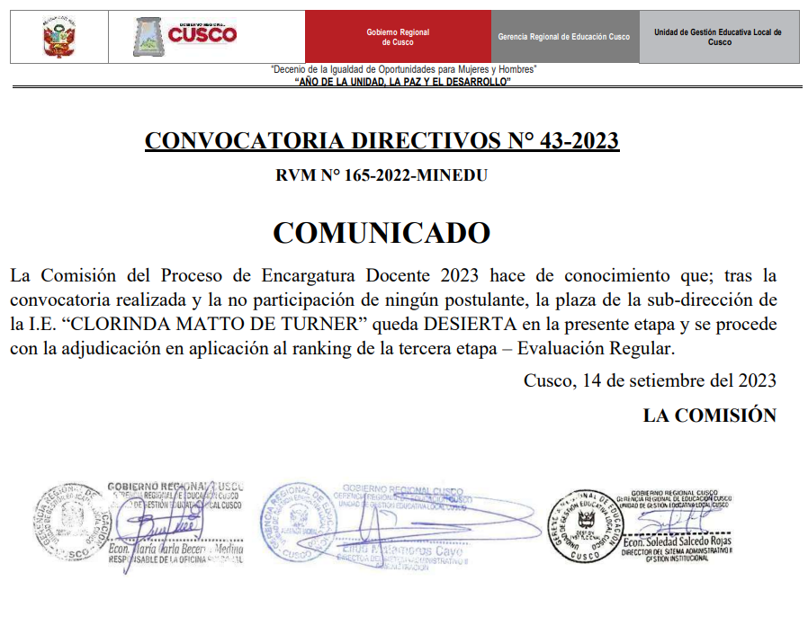 14 Sep 2023 Ugel Cusco Comunicados 14 de septiembre de 2023 COMUNICADO N° 43 La Comisión del Proceso de Encargatura Docente 2023 hace de conocimiento lo siguiente: Ver comunicado …>>> Anterior Noticia Siguiente Noticia