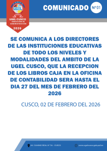 02 Feb 2026 Ugel Cusco Comunicados 2 de febrero de 2026 Comunicado – Oficina de Contabilidad Anterior Noticia